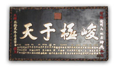 “峻极于天”匾牌为清代木匾。其用意一语双关,一是赞美清代创建的纯阳宫宏伟高大,可以与天穹相毗连。二是赞美真武大帝的功德无量,威力无边。关于“峻极”二字的应用,宋代文人陈纲有“峻极巍峨势望雄,层峦迭障翠重重”的佳句。